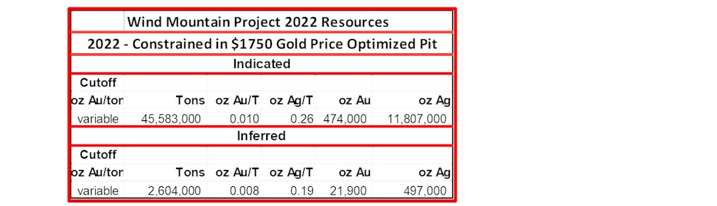 After verifying and slightly modifying the Wind Mountain 2012 global resource based on subsequent drilling, which was confirmed to within less than 1 per cent, a total pit-constrained resource was calculated by RESPEC utilizing the approximately three-year trailing-average, base-case price of $1,750 (U.S.) per ounce of gold and $21 (U.S.) per ounce of silver. Results are provided in an attached table.