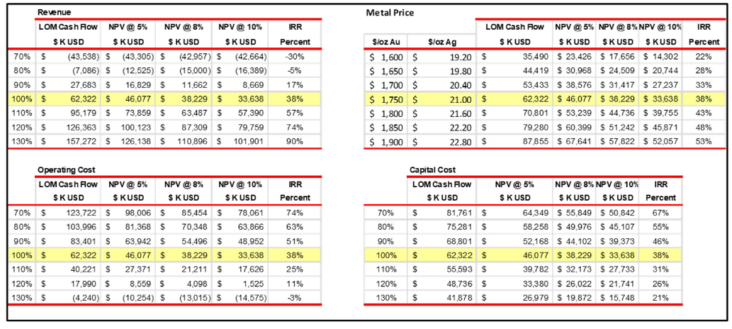 Sensitivity studies by RESPEC are presented in an attached table. RESPEC notes that additional studies, such as further metallurgical studies to evaluate crushing higher-grade portions of the deposit and grid drilling to delineate economic portions of the previously mined waste rock, which are given no value in the current model, could further enhance the economics. For example, RESPEC notes that 1.1 million tons of historic mine waste is currently classified as waste and must be removed during phase I mining; however, results of limited drilling, surface sampling and trenching by Bravada suggest the material contains potentially recoverable gold. RESPEC and Woods recommends that the material be placed in a stockpile for additional study or utilized as over liner on the leach pads; the material potentially would be added to the currently designed phase I pad to further reduce the strip ratio and increase positive economics.
