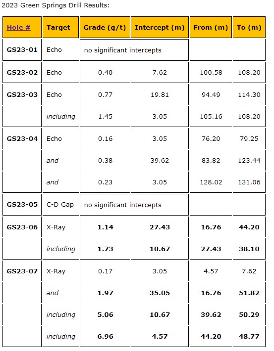 has provided the first drill results from the 2023 exploration program at the Green Springs gold project located on the prolific Cortez trend in northeastern Nevada.