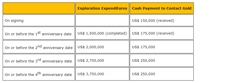 Contact Gold remains the project manager at Green Springs for year 2 of the earn-in and will collect a management fee based on eligible expenditures through the earn-in.