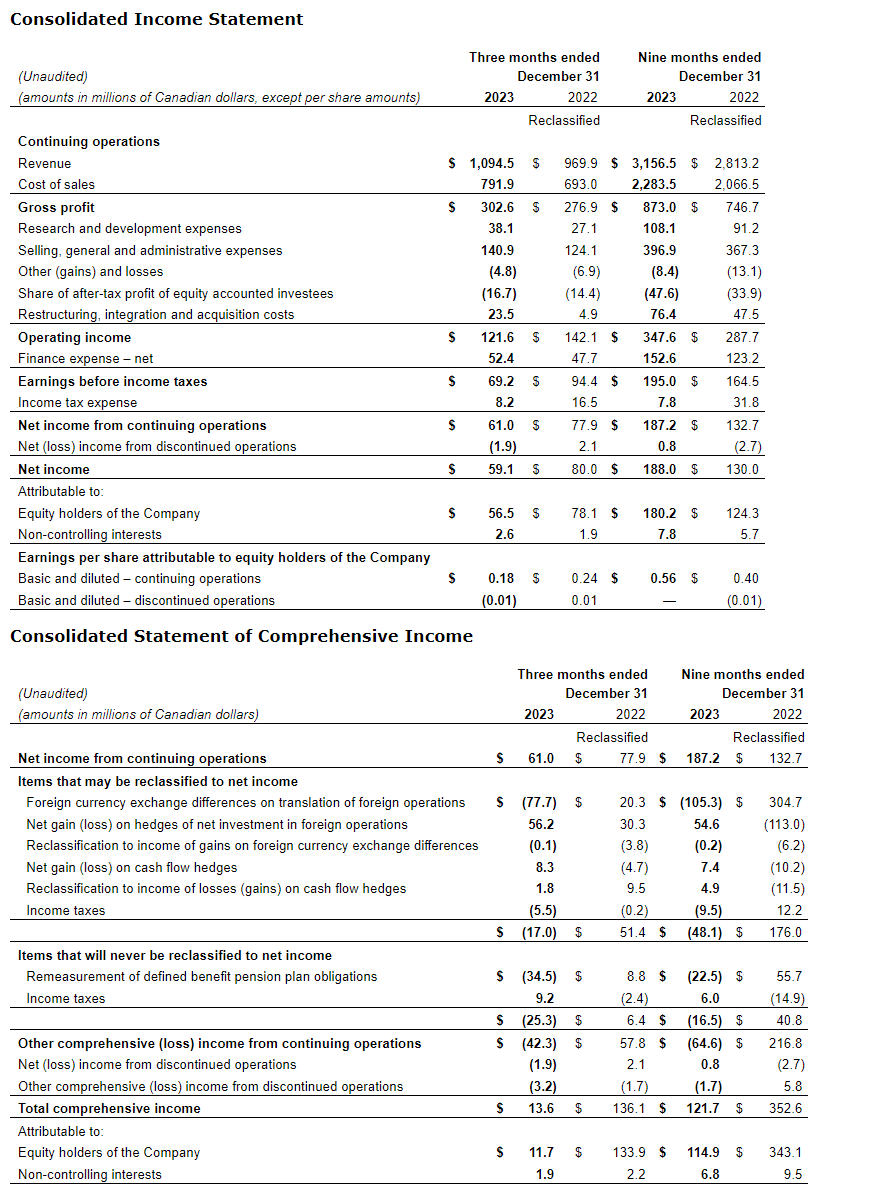 Net loss from discontinued operations was $1.9-million this quarter, compared with a net income from discontinued operations of $2.1-million in the third quarter of fiscal 2023. The decrease compared with the third quarter of fiscal 2023 was mainly attributable to transaction costs of $2.2-million incurred in the third quarter of fiscal 2024 in relation to the expected sale of the health care business.