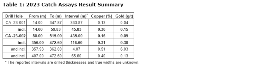 Hole CA-23-001 targeted a high IP chargeability anomaly underlying an outcrop which returned 0.31 per cent copper with 0.17 g/t gold over 12 m from a hand trench. The hole encountered basalt, diorite and gabbro host rocks. Copper and gold mineralization is associated with propylitic (chlorite-albite-epidote-calcite) to sodic (albite-chlorite-pyrite) alteration of all host rock types that carry quartz-carbonate plus or minus pyrite-chalcopyrite veins, and disseminated to blebby pyrite, pyrrhotite and chalcopyrite (sulphides listed in decreasing order of abundance). The hole ended in anomalous copper grades, with visual pyrrhotite and pyrite mineralization noted.