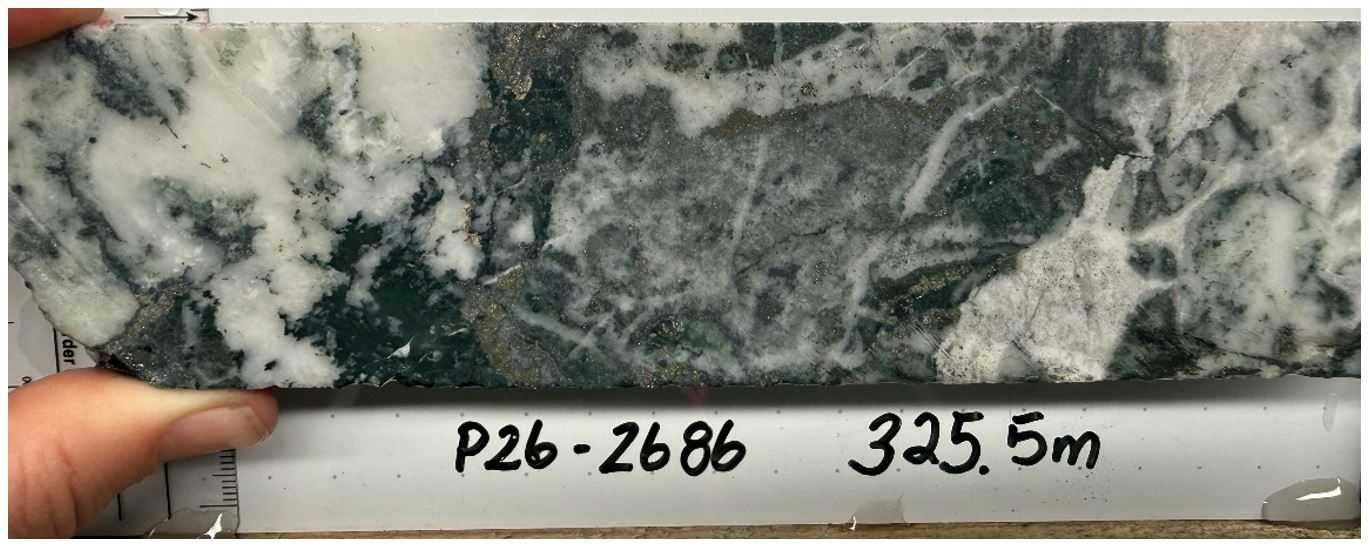 Gold mineralization is hosted within zones of quartz breccia, with sulfide infill and veining both within and outside the breccia zones. Sulfide mineralization includes pyrite, sphalerite, and galena with lesser amounts of chalcopyrite. Visible gold was identified in 2 of the 5 holes reported in this news release, including an intercept of 552.0 g/t Au over 0.5m in P26-2686 (see Figure 3(a)). This intercept occurs within a wider interval of 17.95 g/t Au over 22.0m represented by a well-defined zone of quartz-sulfide-cemented breccias and veins. Gold veining is interpreted as a later stage event occurring within the wider mineralized zone.
