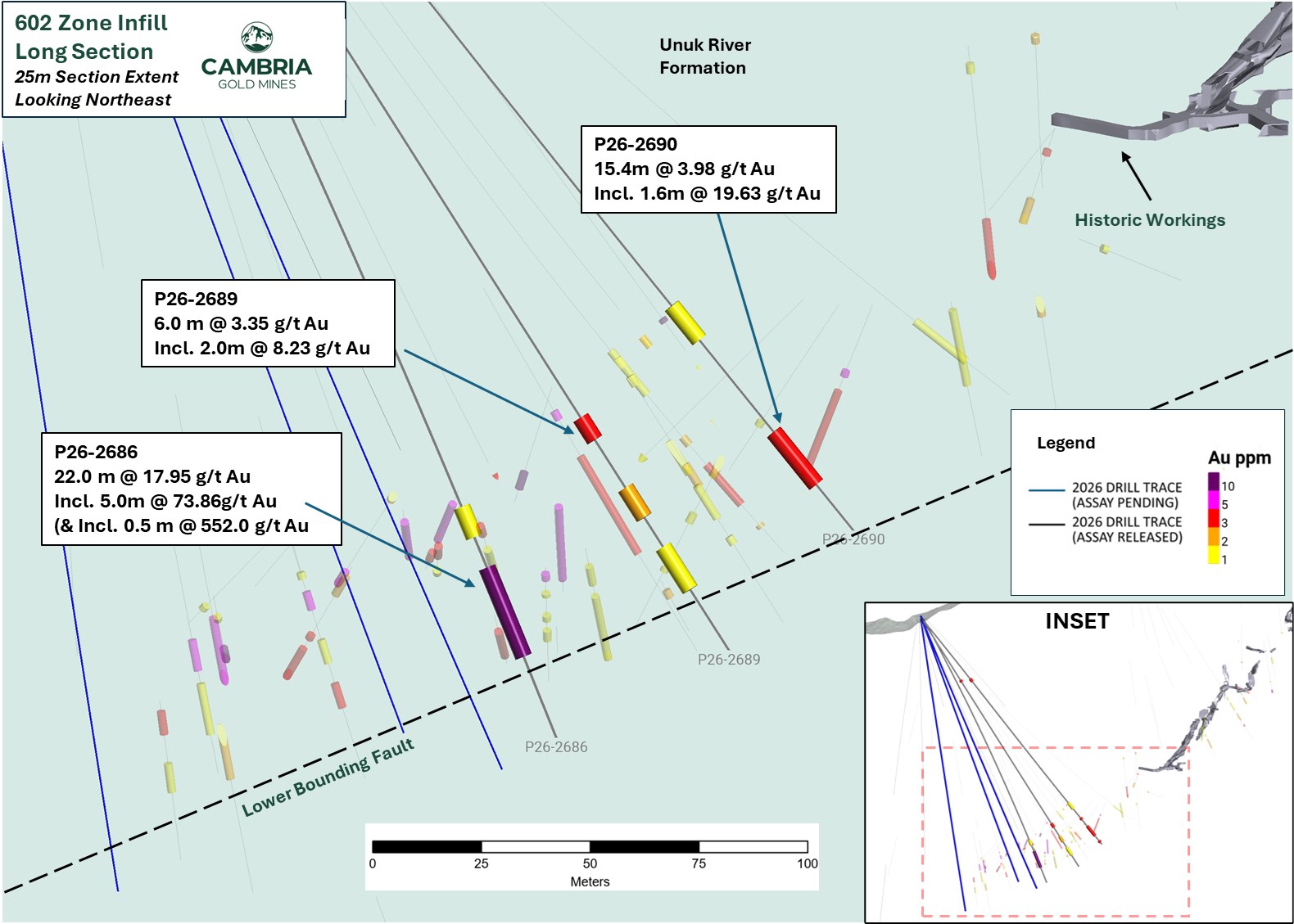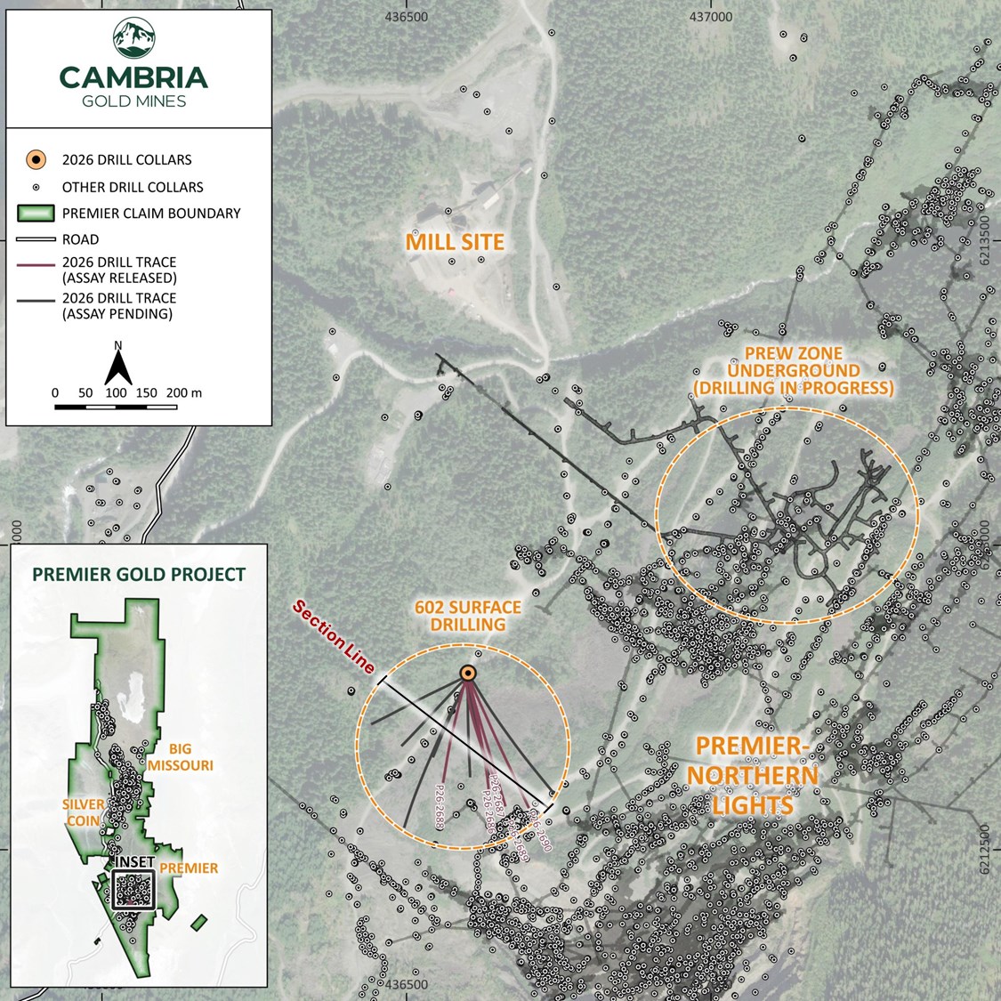 "This drilling at the 602 Zone is delineating high-grade mineralization, which could be accessed with additional development from the recently constructed underground workings at the historic Premier Mine," said Robert McLeod, President and CEO of Cambria Gold Mines. "Two underground drills are currently delineating the Prew Zone at Premier; our objective is to establish the strong continuity similar to the nine primary shoots that were historically mined at the deposit."