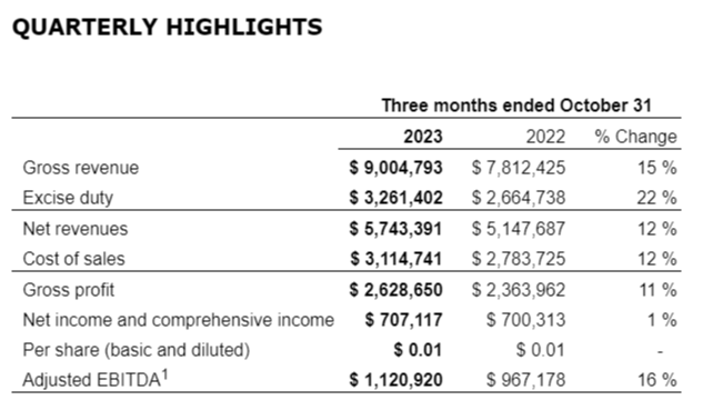 New products drive demand: All new products launched during previous quarters have continued to post growth and record sales in Alberta, British Columbia, Manitoba, Saskatchewan and Ontario, including the company's newest and first-of-its-kind product line, superslim cigarette-style prerolls, Electric Dartz, which have received solid adoption across the provinces.
