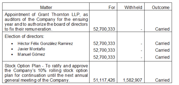 Candelaria Mining Corp. has released voting results from the company's annual general meeting of shareholders held on April 19, 2024.