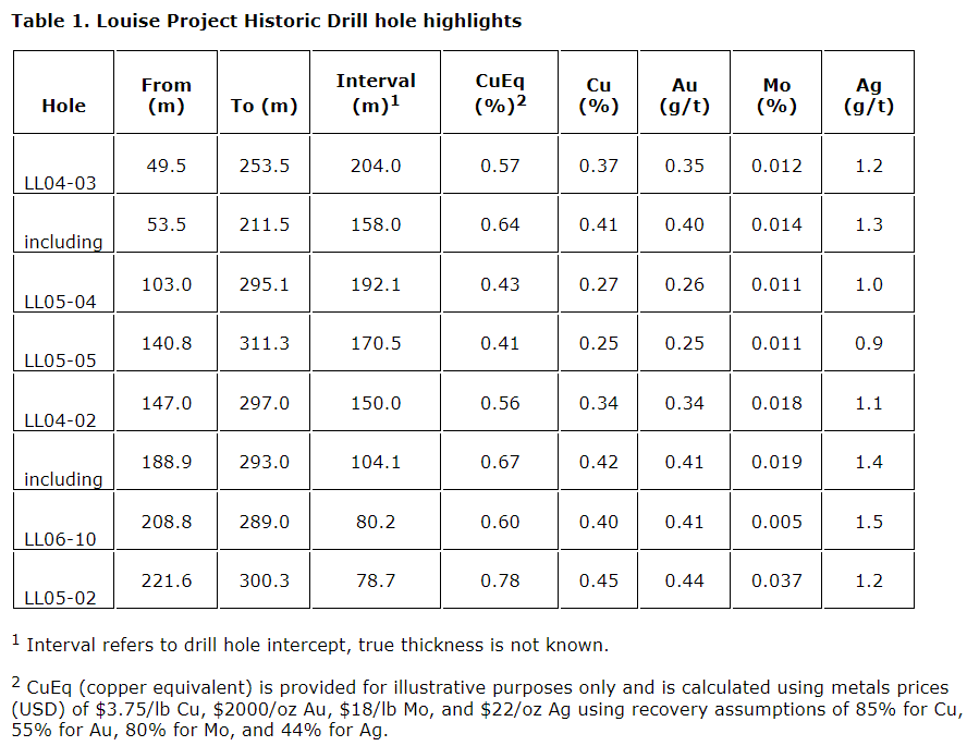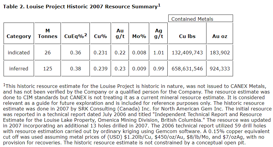 The Louise project contains historic resource estimates conducted in 2006 and 2007. The company is not relying on these estimates but is using them as a positive exploration guide demonstrating that a strong porphyry system occurs at the project, and gives insight into the character and controls on mineralization. The project contains a large amount of high-quality surface and drill hole exploration data that will aid immensely in the understanding of the system and the targeting of new zones.