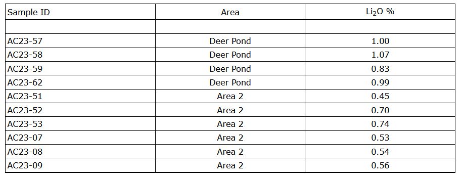 Caprock's CEO Mr. Vishal Gupta states: "The discovery of high-grade lithium-bearing zinnwaldite at Area 2 that lies over one kilometre to the north-west of the first batch of samples at the Deer Pond Area for which multiple assays of over 1.00% Li2O were announced previously, reinforces our belief that a significant portion of the vast greisen zone at Ackley may contain appreciable lithium mineralization. Today we also announce additional new assays from the Deer Pond Area (included in Figure 1 above), further demonstrating the high-grade nature of the lithium mineralization at Ackley."