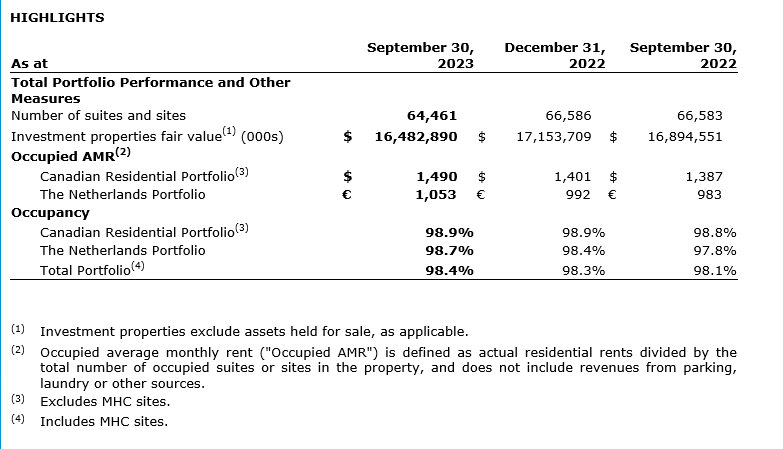 Same properties for the three and nine months ended Sept. 30, 2023, are defined as all properties owned by Canadian Apartment continuously since Dec. 31, 2021, and therefore do not take into account the impact on performance of acquisitions or dispositions completed during 2023 and 2022, or properties that are classified as held for sale as at Sept. 30, 2023.