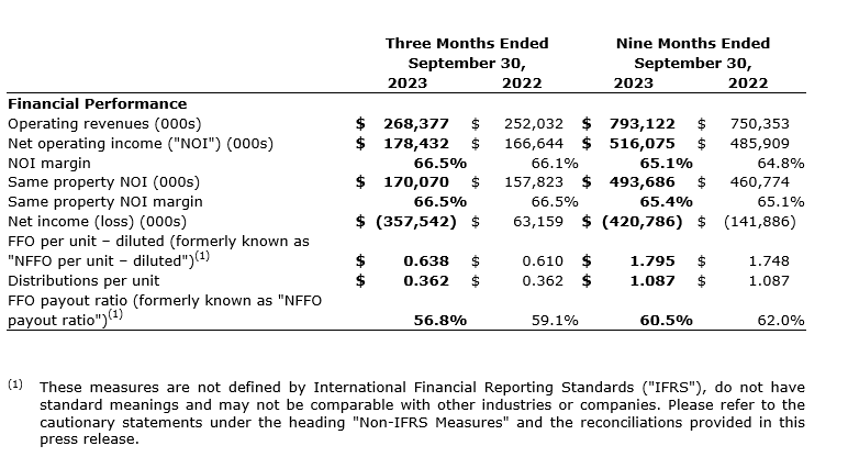 - Diluted FFO (funds from operations) per unit (formerly known as diluted NFFO (normalized funds from operations) per unit) increased by 4.6 per cent and 2.7 per cent for the three and nine months ended Sept. 30, 2023, respectively, compared with the same periods last year, primarily due to same-property operational growth and supplemented by accretive NCIB purchases.