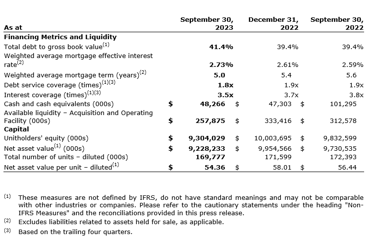 - Diluted NAV (net asset value) per unit as at Sept. 30, 2023, decreased to $54.36 from $57.08 as at June 30, 2023, and $58.01 as at Dec. 31, 2022, primarily due to fair value losses recognized in investment properties, partially offset by the effects of accretive purchases of trust units for cancellation through the NCIB program.