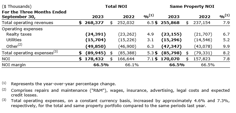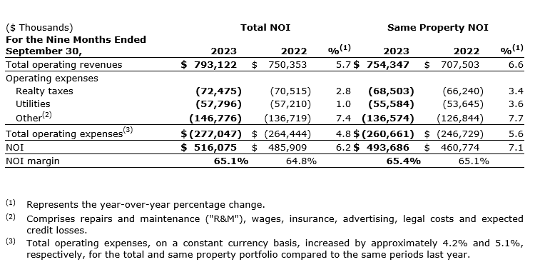 NOI (net operating income) increased by 7.8 per cent and 7.1 per cent, respectively, for the same-property portfolio for the three and nine months ended Sept. 30, 2023, compared with the same periods last year. Additionally, same-property NOI margin remained consistent at 66.5 per cent for the three months ended Sept. 30, 2023, and increased to 65.4 per cent, up 0.3 per cent, for the nine months ended Sept. 30, 2023, compared with the same periods last year.