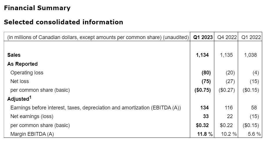 - Adjusted earnings before interest, taxes, depreciation and amortization (EBITDA (A)1) of $134 million (compared with $116 million in Q4 2022 and $58 million in Q1 2022)