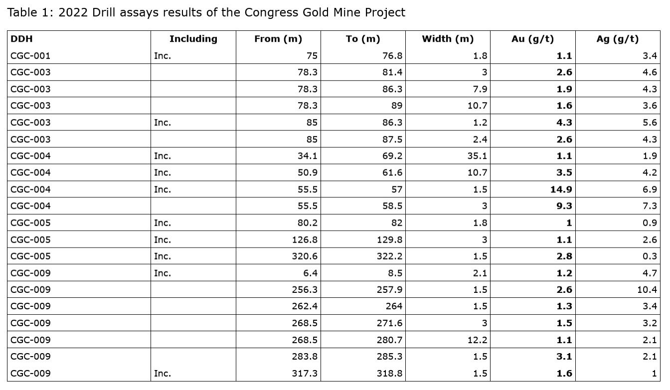 The historic Congress mine produced approximately 500,000 ounces gold from the Congress and Niagara veins. All production was from underground workings. Casa, in a news release dated 20-09-2022, announced completion of ten drill holes with lengths between 74.7 and 365.8 metres (245.1 feet and 1200.2 feet) and in a news release dated 30-01-2023, announced initial assay results in a tabulation of significant intercepts that included the following: