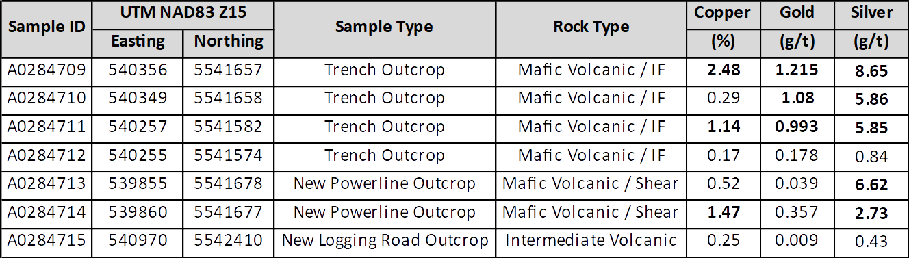 - sample A0284714 returned 1.47% Cu and 0.357 g/t Au