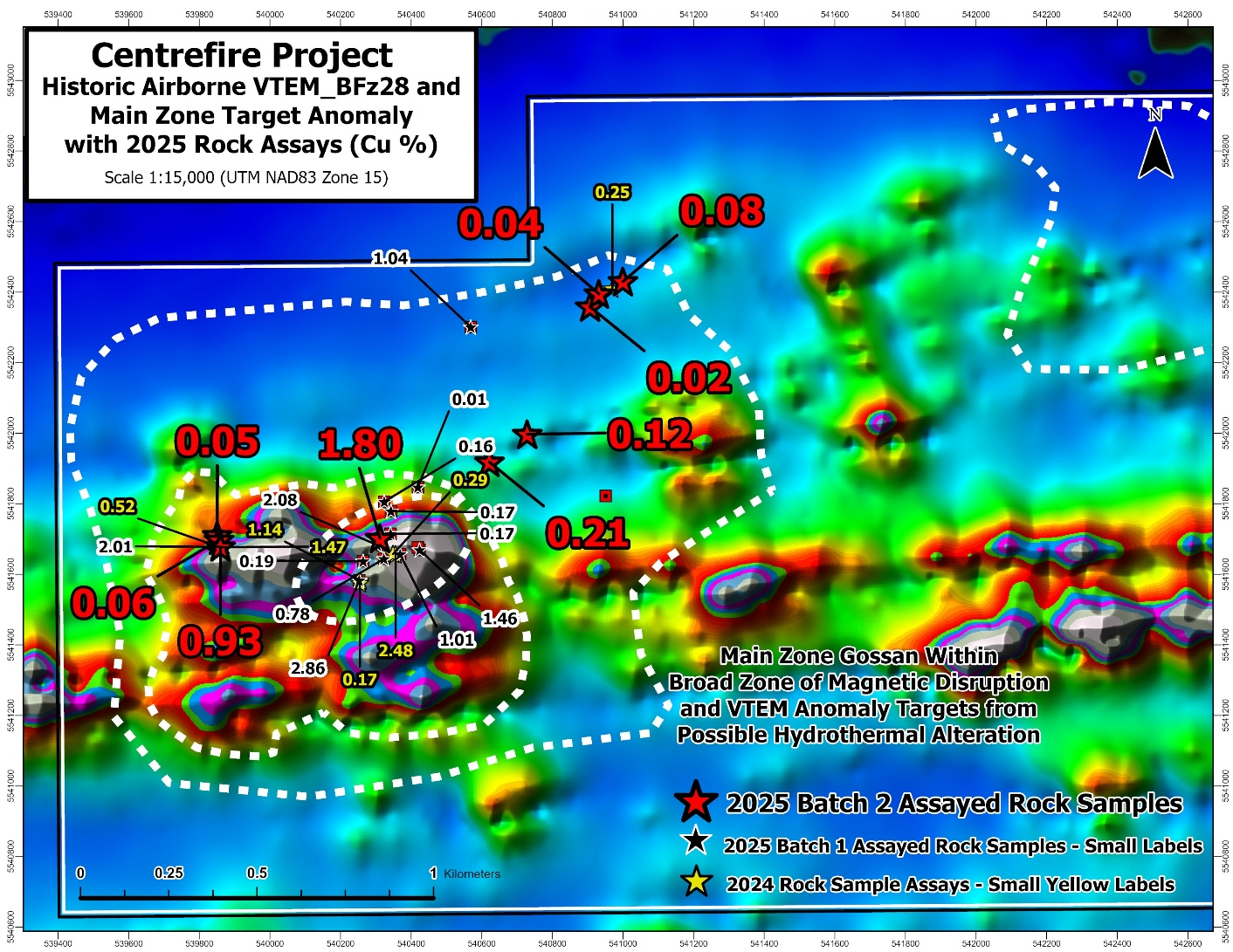 Figure 1: Locations and copper assays of recent Batch 2 and previous sampling at the MGZ at Centrefire, plotted on historic VTEM conductors.