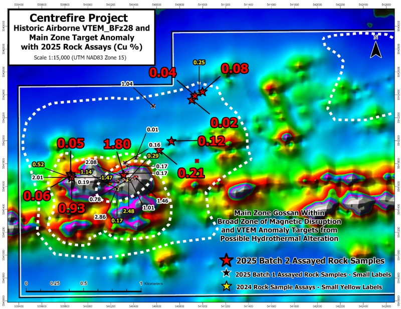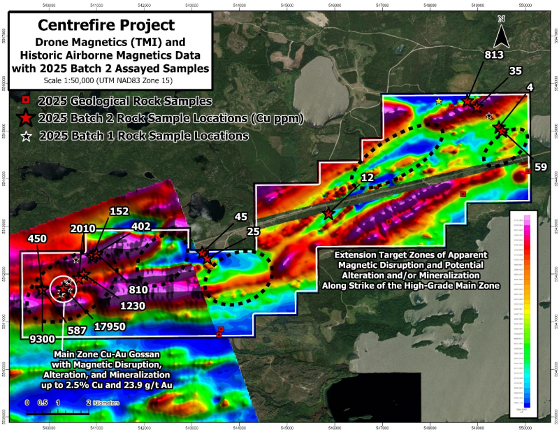 Vancouver, British Columbia – TheNewswire - January 26, 2026. Cascade Copper Corp. (CSE:CASC, FRA:91O ) (“ Cascade ” or the “ Corporation ”) is pleased to announce that it has received assay results from the second batch of samples from a field program of ground truthing geophysical anomalies and rock sampling at its Centrefire Copper and Gold Project (the “ Project ”) located ~40 kilometres northeast of Dryden, Ontario, Canada. The field work was completed in Q4 2025. This batch represents 16 of 41 rock samples that were collected across the Project. The results of the first batch of 13 samples were release on January 6 th 2026 and included up to 2.86% Cu, 2.84 g/t Au, and 29.40 g/t Ag in grab samples.  The Corporation is also pleased to announce that ongoing magnetic inversion modelling and compilation is revealing excellent priority target follow-up areas for mapping, sampling, and possibly drilling.