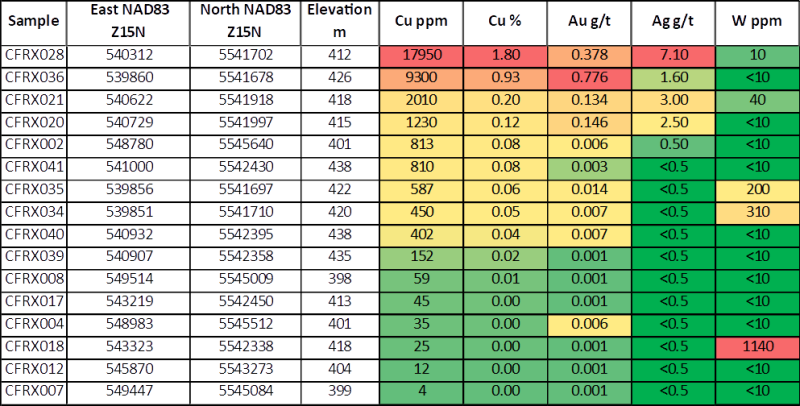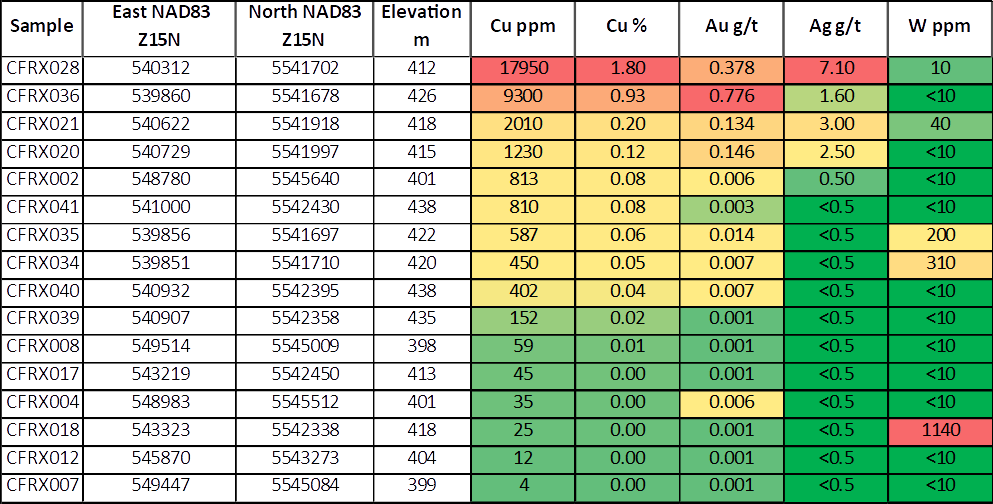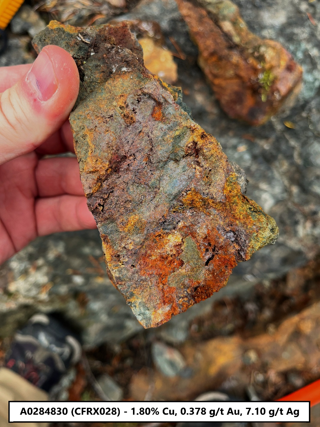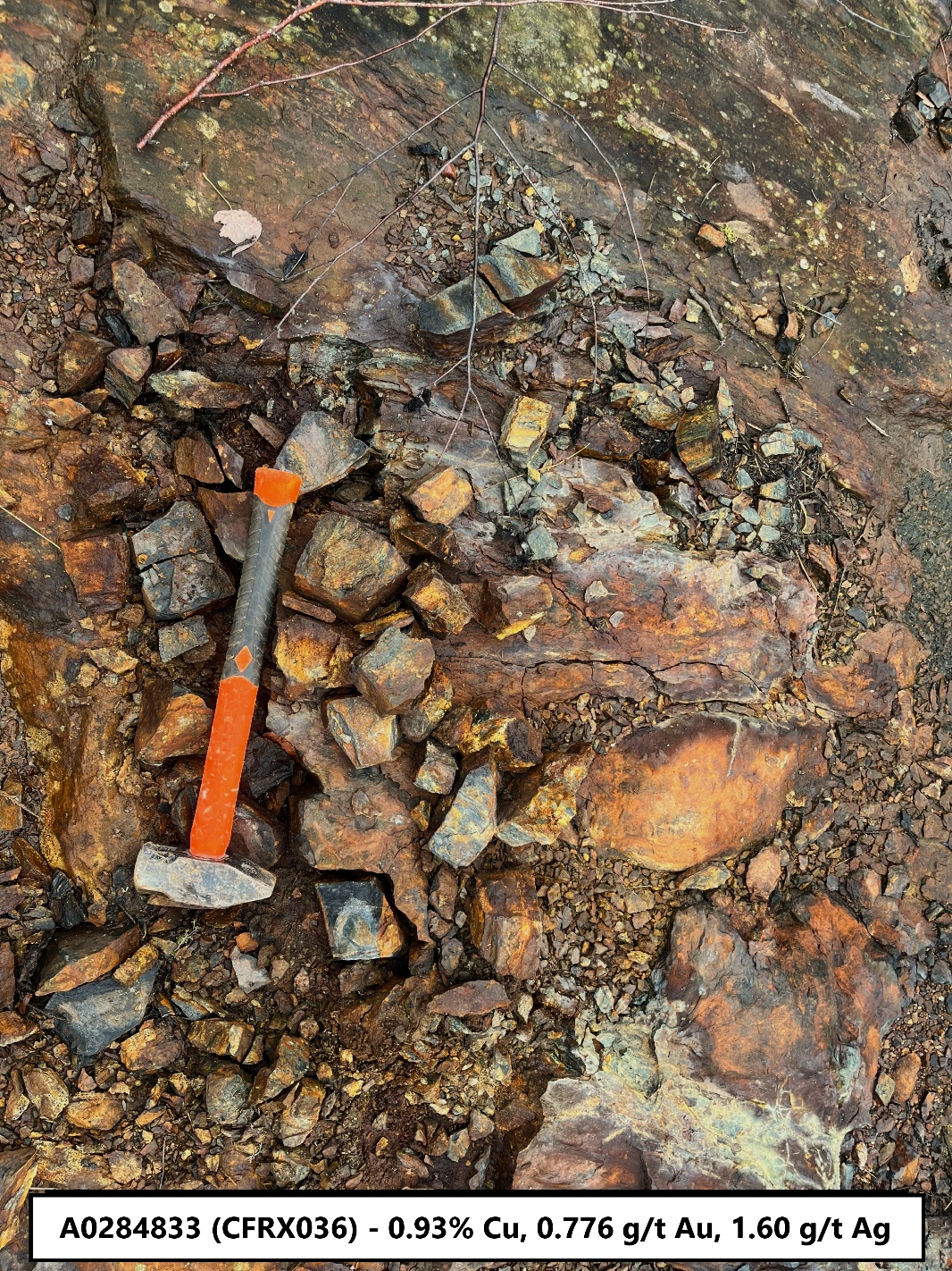 The second batch of samples from the 2025 field program confirmed strong copper, gold, and silver mineralization within the MGZ with grab sample CFRX028 returning 1.80% copper from a highly mineralized and altered mafic pillow basalt. (see image below in Figure 3).  Sample CFRX036 returned 0.93% copper from a similar looking mineralized and altered pillow basalt that also had an extremely anomalous gold value of 0.776 g/t Au. CFRX036 is located near the western exposure of the MGZ and approximately 450m from sample CFRX028.  Of significance is the sample CFRX002 taken near the eastern limit of the project area that returned 813 ppm Cu (0.08% Cu) which indicates copper mineralization within the lithological package over 9.0 kilometers along strike from the MGZ.