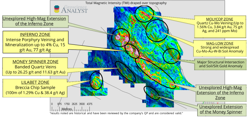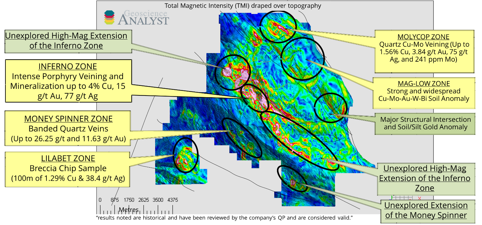 The expectant outcome of this survey is to distinguish new or validate existing targets, especially within areas containing nil or minimal historic work but promising magnetics signatures such as the “Unexplored High-Mag Extensions both northwest and southeast of the Inferno Zone.” Besides the known porphyry association on the Project, the fact that this particular package of rocks throughout the region is known to host skarn and VMS occurrences is encouraging and expands the potential for discovery with this this type of survey.