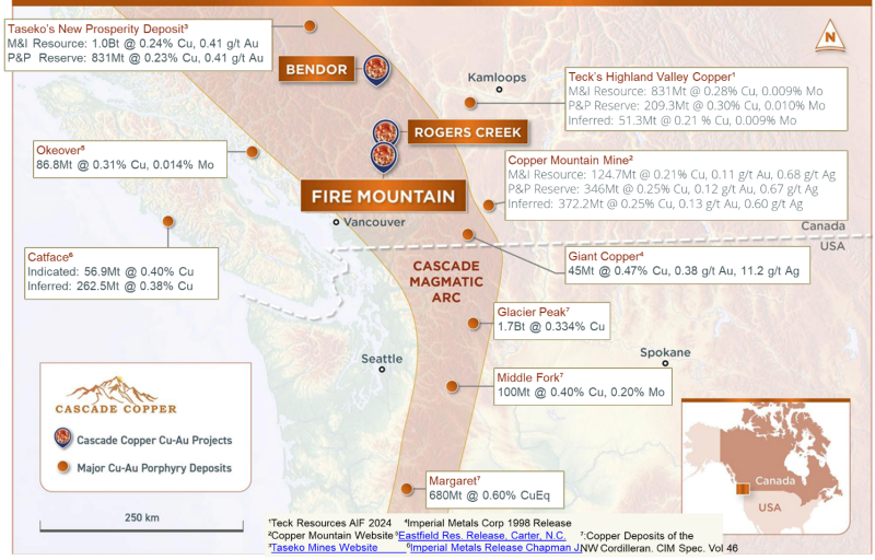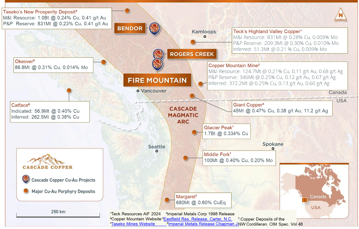 Figure 1 : Location of the Fire Mountain Copper-Gold Porphyry Project within the Cascade Magmatic Arc showing locations of nearby porphyry and epithermal deposits.