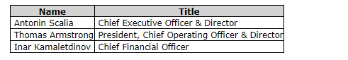 Antonin Scalia is the current chief executive officer of the corporation and Thomas Armstrong is the current president and chief operating officer. Both Mr. Scalia and Mr. Armstrong will continue in their current roles. Inar Kamaletdinov is expected to be onboarded as the chief financial officer of the resulting issuer.