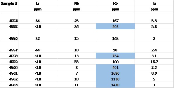 Pegmatite occurrences thus far sampled in CBLT's claims contain anomalous tin, tantalum, and rubidium with local anomalous lithium. CBLT is highly encouraged by these multi-element anomalies.