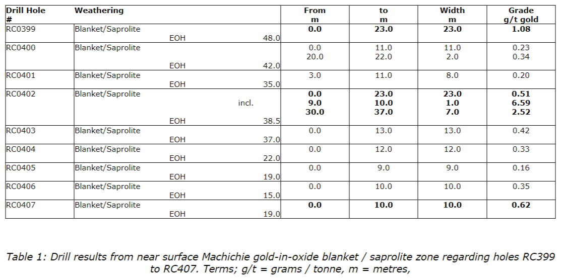 These drill results from Machichie confirm the presence of gold-in-oxide in basement saprolite containing zones of higher-grade mineralization. Machichie is located just 500m north of the MG deposit. The thickness, depth of weathering profile, and lateral extent of this zone at Machichie have not yet been well defined. However, based on limited drilling and trenching further west and in the area of the Machichie West target, its aerial extent could be signicant (see press release dated October 24, 2022).