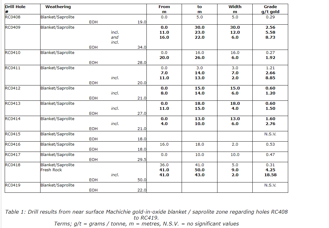 Drill holes RC409 and RC410 were drilled on section 553230 in the eastern part of the Machichie Main zone. The holes were designed to follow up on the higher-grade zone of gold-in-oxide mineralization intersected previously in RC hole RC041 which previously returned 19 m at 0.9 g/t.