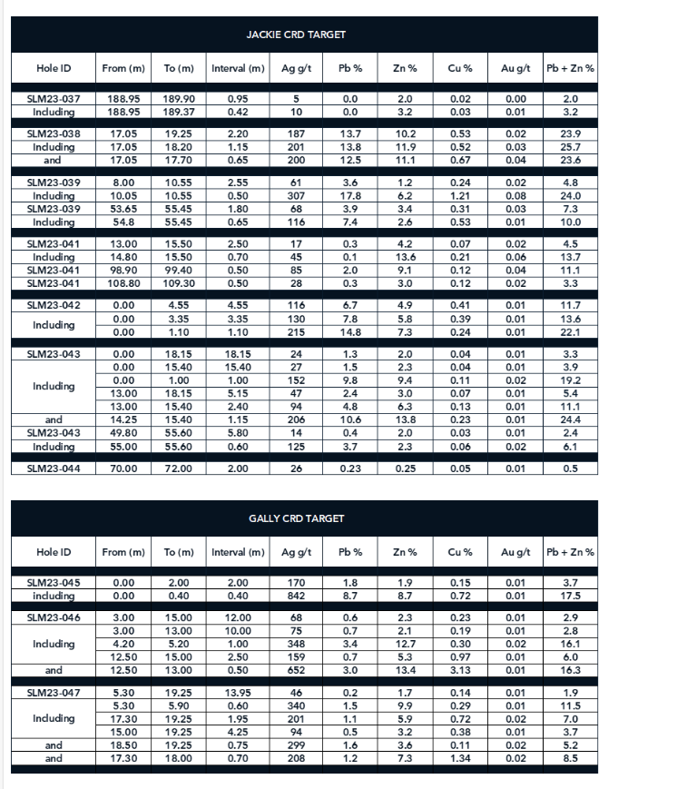- SLM23-028 (Pete's) intersected 6.40 m grading 159 grams per tonne silver, 8.7 per cent lead, 7.7 per cent zinc and 0.23 per cent copper from 27.43 m depth, including 0.57 m of 301 g/t Ag, 11.5 per cent Pb, 10.7 per cent Zn and 0.31 per cent Cu;