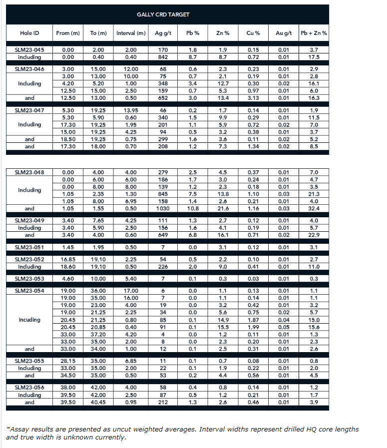 - SLM23-048 (Gally) intersected eight m of 139 g/t Ag, 3.5 per cent Pb plus Zn, and 0.18 per cent Cu from surface, including 1.30 m of 845 g/t Ag, 31.3 per cent Pb plus Zn, and 1.10 per cent Cu, including 0.50 m of 1,030 g/t Ag, 32.4 per cent Pb plus Zn, and 1.16 per cent Cu.