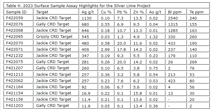 Prospecting and surface sampling in 2023 resulted in the collection of 89 rock samples, which successfully extended the Gally-Sulphide City-Pete's high-grade corridor by 850 m to the south to a total length of 2.5 km. A mineralized structure at the Jackie target demonstrates continuous mineralization for 575 m along strike and continues for an additional 420 m to the north where it remains untested. Fault splays and dike offshoots from this structure are also variably mineralized. In 2023, 12 samples returned over 200 g/t Ag, 14 greater than 2 per cent Pb, 26 greater than 2 per cent Zn and 14 samples graded over 0.20 per cent Cu.