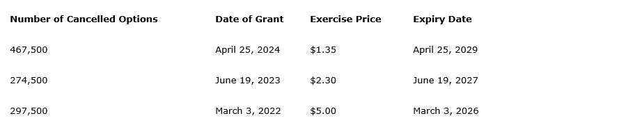 The company also announces that it has, with the consent of the applicable holders, cancelled an aggregate 1,039,500 stock options held by certain officers, directors and consultants of the company. The cancelled options are detailed in the attached table.
