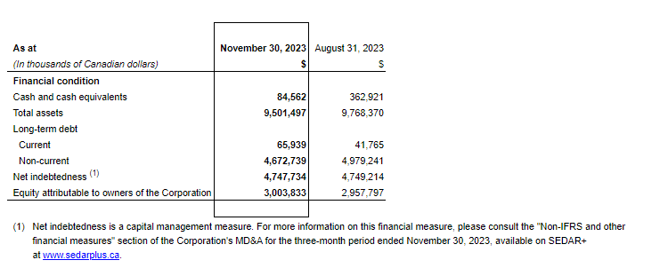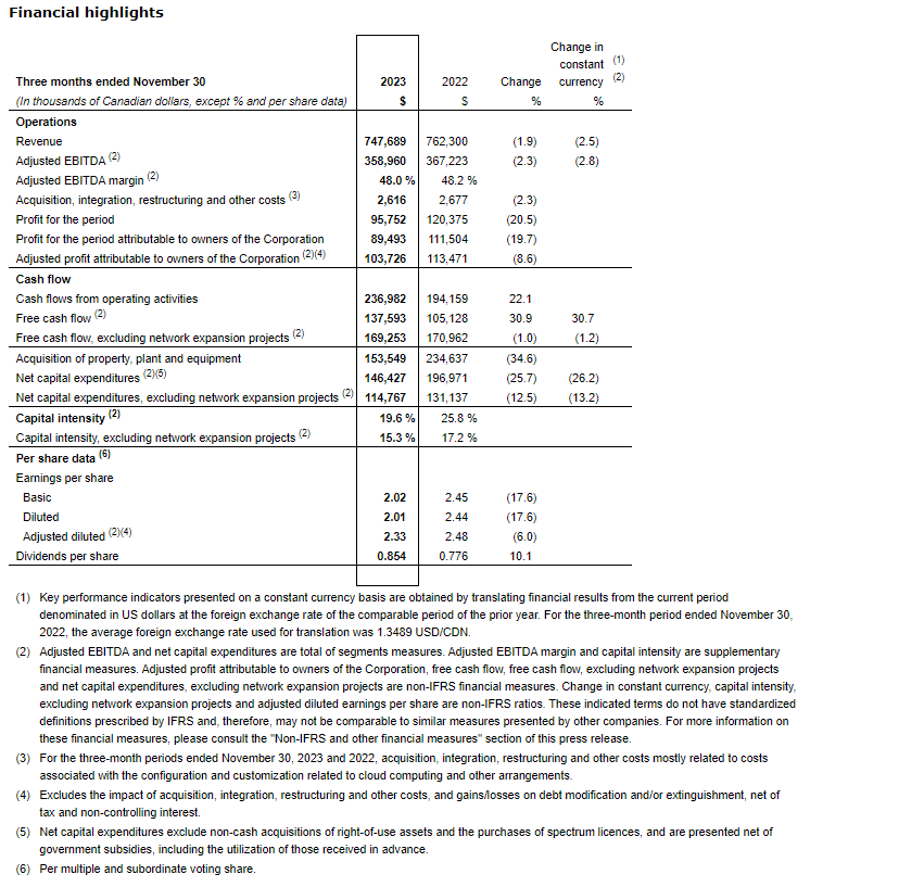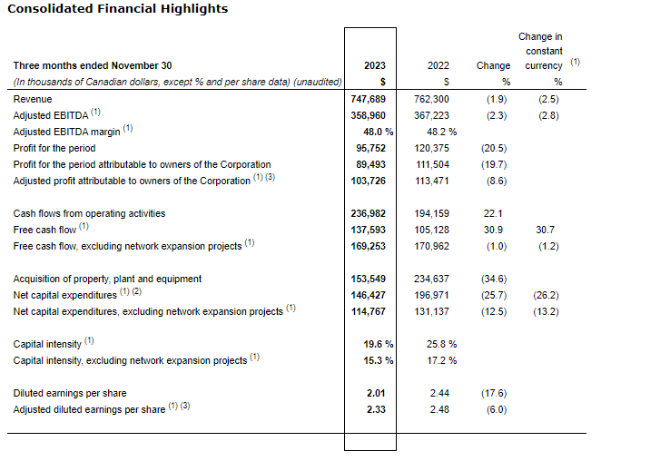 Profit for the period amounted to $95.8-million, of which $89.5-million, or $2.01 per diluted share, was attributable to owners of the corporation compared with $120.4-million, $111.5-million, or $2.44 per diluted share, respectively, in the comparable period of fiscal 2023. The decreases in profit for the period and profit attributable to owners of the corporation resulted mainly from higher financial expense, mostly due to a pretax $16.9-million non-cash loss on debt extinguishment recognized following a $1.6-billion (U.S.) refinancing in September, 2023, lower adjusted EBITDA, and higher depreciation and amortization expense, partly offset by lower income tax expense.