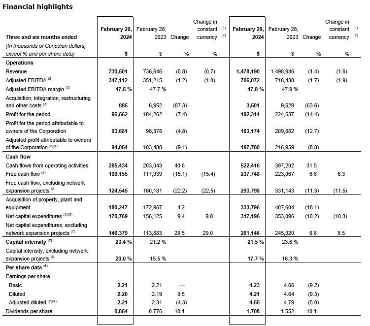 COGECO COMMUNICATIONS RELEASES ITS FINANCIAL RESULTS FOR THE SECOND QUARTER OF FISCAL 2024