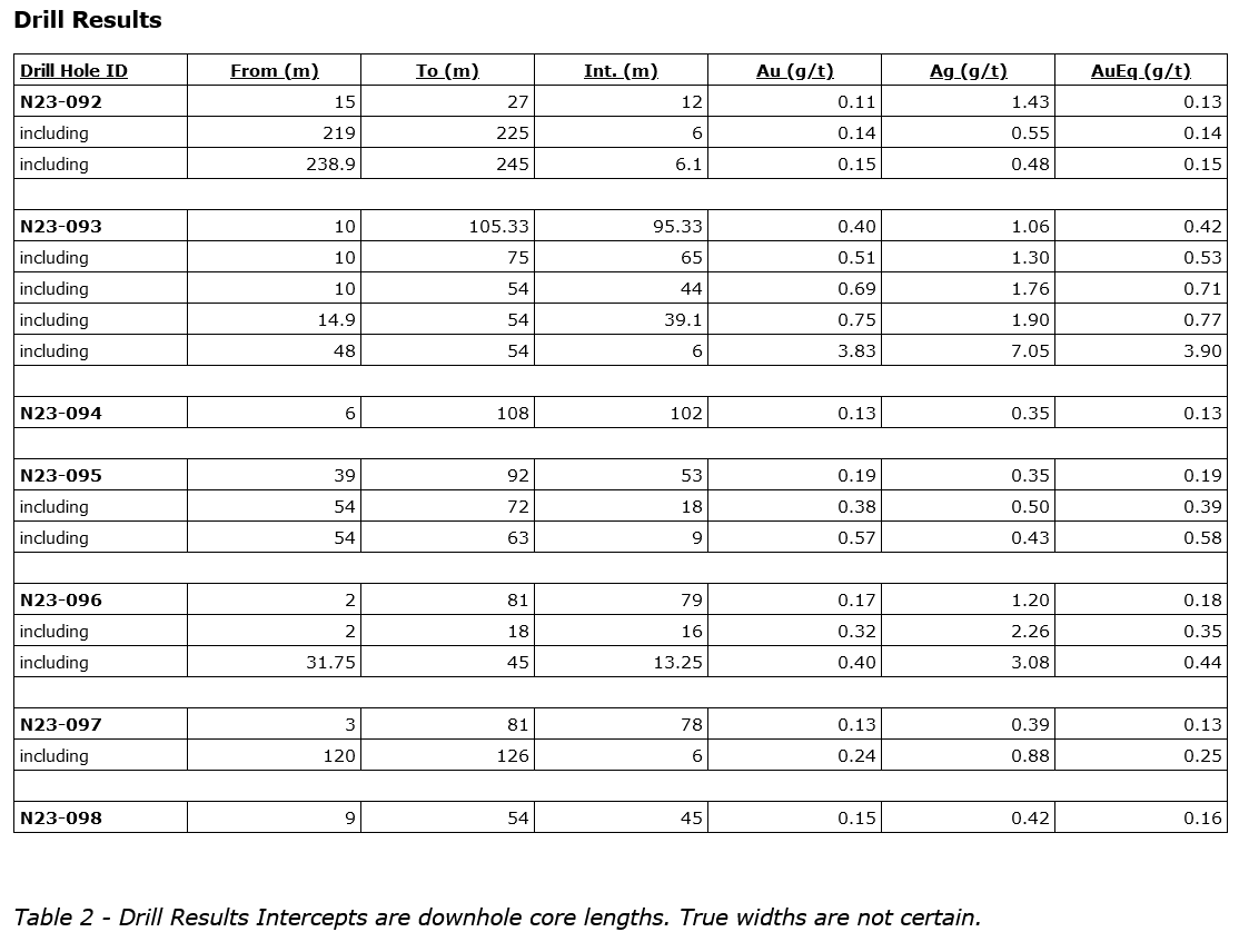 Hole N23-097 was collared west of the current inferred mineral resource and intercepted elevated gold values including 0.13 AuEq from 2-81 metres.