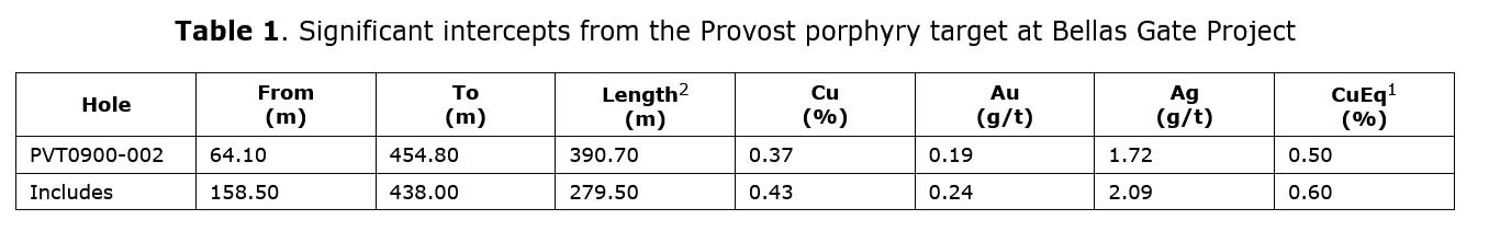 Drill hole PVT0900-002 intersected 390.7m at 0.37% copper and 0.19 g/t gold (0.50% CuEq1) from 64.1m, including 279.5m at 0.43% copper and 0.24 g/t gold (0.60% CuEq1). This is the broadest interval of copper-gold mineralization reported to date at the Company's 100% owned Bellas Gate project in Jamaica.