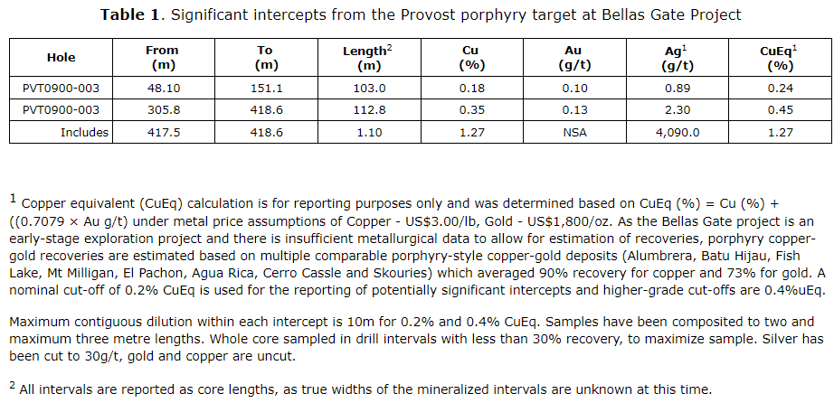 Drilling at Provost has traced porphyry- and epithermal-style mineralization along 400 m of strike length and approximately 400 m down dip. PVT0900-003 expands the northwest-striking mineralized zone an additional 150 m. Mineralization remains open along strike and at depth. The company is undertaking real-time modelling of important structural, lithologic and mineralized features at Bellas Gate, which is used to further refine the planned 8,500 m of drilling.