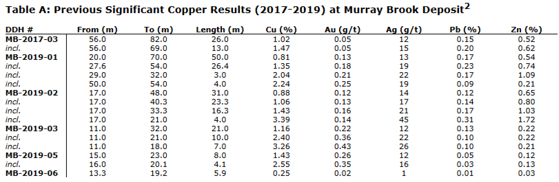 - An untested stringer zone horizon adjacent to the known deposit was discovered in 2019 and hole MB-2019-01 returned 26.4 metres grading 1.35 per cent copper, 19 grams per tonne silver and 0.75 per cent zinc starting from 26 metres of surface; these intersections remain largely open and are the focus of this 2,500-metre program; other western boundary drill hole intersections can be found in Table A below;