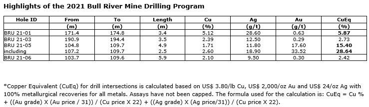 The purpose of the 2021 drilling program was to test the downdip extension of the vein systems under the current workings to demonstrate the potential that the current resource can be extended on strike and to depth. Diamond drill hole BRU 21-05 was particularly encouraging, intersecting the highest gold values in the history of the property. All drill hole intersections met or exceeded the minimum width for mining.