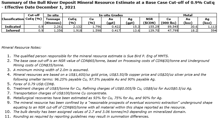 The attached resource estimate table summarizes the current indicated and inferred resource estimate for the project at the base-case copper equivalent (CuEq) grade of 0.9 per cent CuEq (see the press release on SEDAR+ dated Feb. 23, 2021). The average thickness of both the indicated and inferred resource is 5.5 metres.