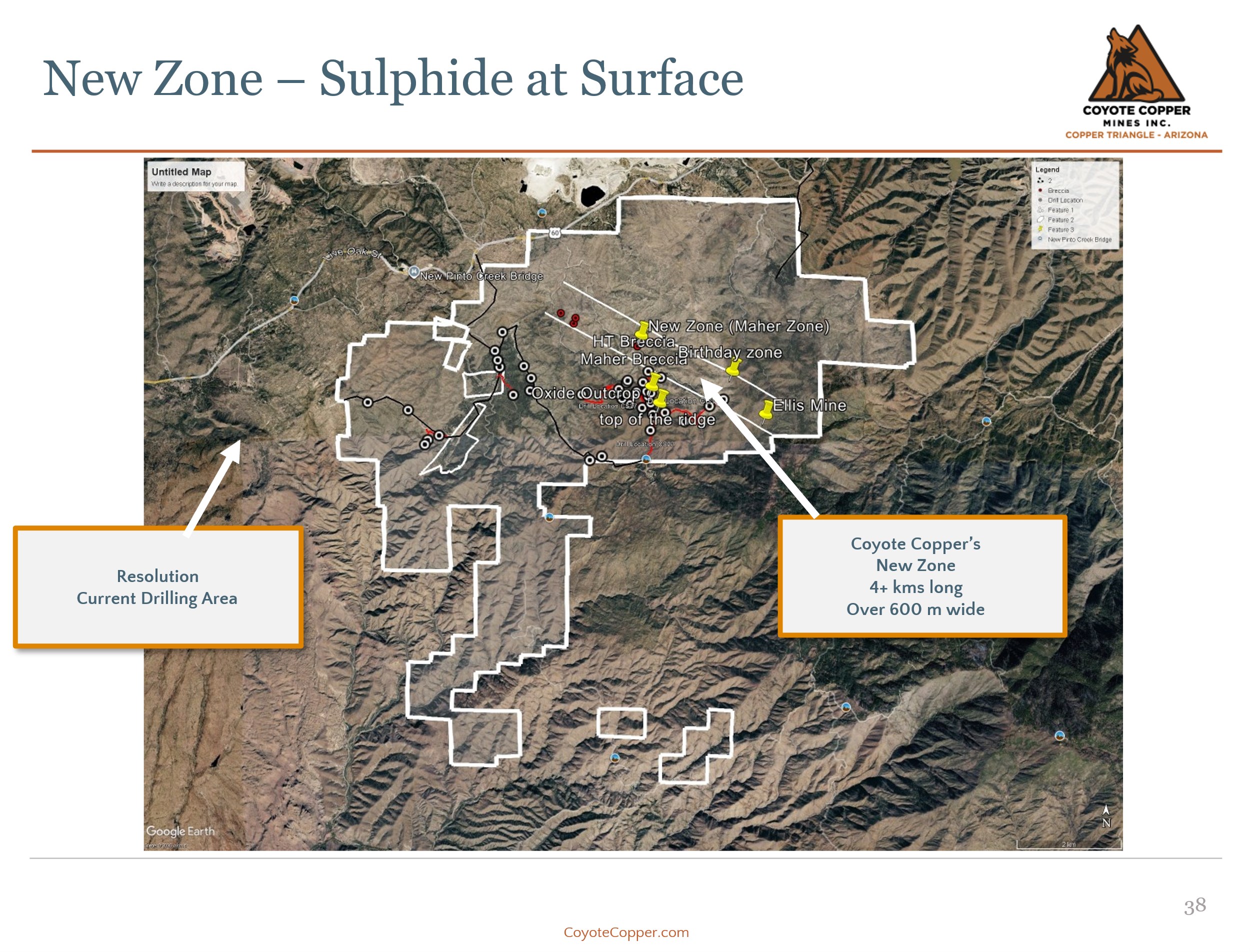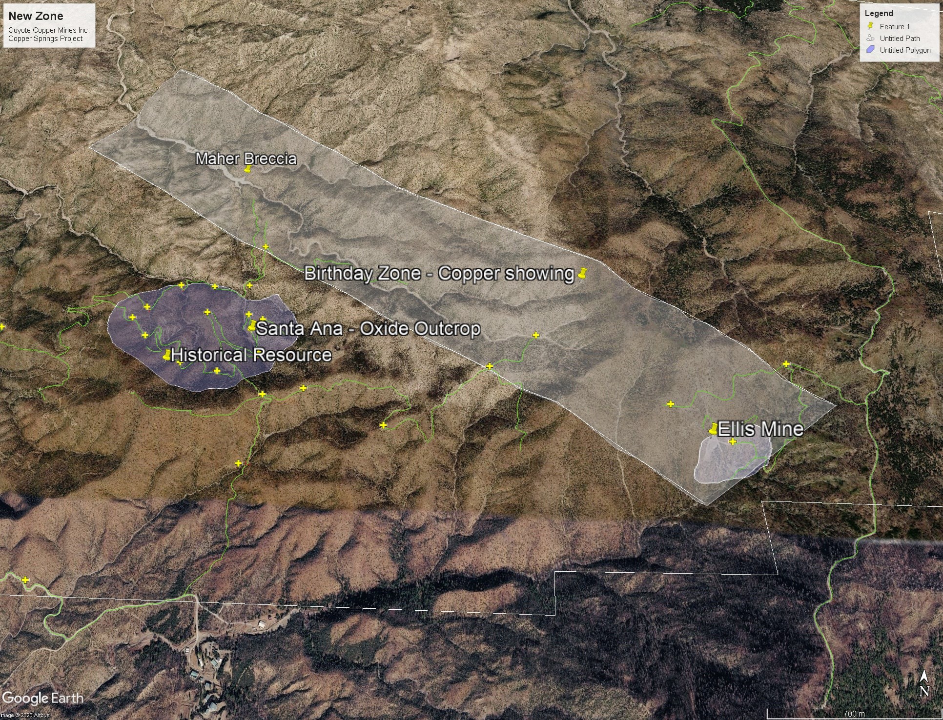 Recent field efforts have led to the identification of a new mineralized zone, which includes a breccia pipe referred to as the Maher Breccia. The broader zone remains under active evaluation, with current project mapping indicating a strike length of more than 4 km and a width exceeding 600 m.