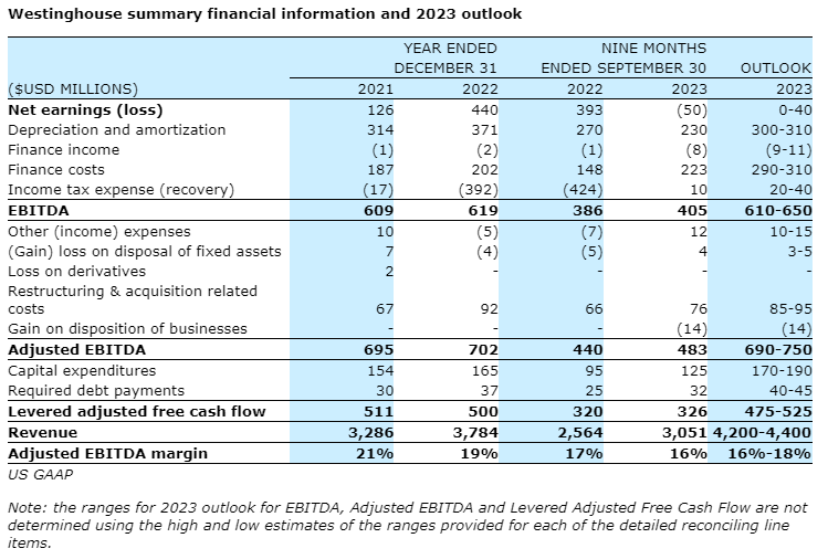 The following financial information is derived from the consolidated financial statements of Westinghouse, which are reported in US dollars and prepared in accordance with US GAAP. EBITDA, Adjusted EBITDA, Levered free cash flow, and Adjusted EBITDA Margin are non-GAAP financial measures and should not be considered in isolation or as a substitute for financial information prepared according to accounting standards. Other companies may calculate these measures differently, so a direct comparison to similar measures presented by other companies may not be possible. The table below reconciles these measures to the closest US GAAP measure. See Westinghouse non-GAAP Measures below for more information.