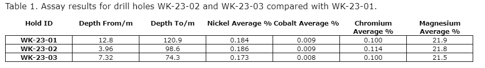 The company is pleased to report the assay results from WK-23-02 and WK-23-03, the second and third drill holes completed in the 2023 drilling season. Comparing the results with the previously reported drill hole WK-23-01, the assay results are quite similar. The nickel, magnesium, cobalt and chromium concentrations are also relatively consistent with the 42 holes drilled in late 2021 and throughout 2022.