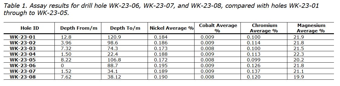 The Company is pleased to report the assay results from WK-23-06, WK23-07 and WK-23-08. Comparing the results with the previously reported results for 2023, the assay results are quite similar. The nickel, magnesium, cobalt and chromium concentrations are also consistent with the 42 holes drilled in late 2021 and throughout 2022.