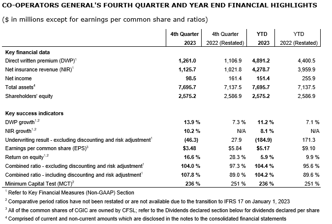 CO-OPERATORS GENERAL INSURANCE COMPANY REPORTS 2023 FOURTH QUARTER AND YEAR END RESULTS