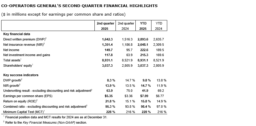 CO-OPERATORS GENERAL INSURANCE COMPANY REPORTS SECOND QUARTER 2025 RESULTS
