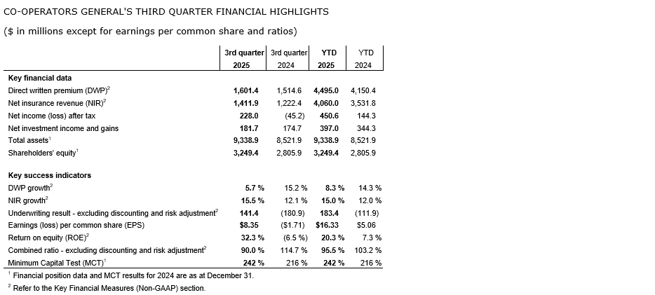 CO-OPERATORS GENERAL INSURANCE COMPANY REPORTS THIRD QUARTER 2025 RESULTS