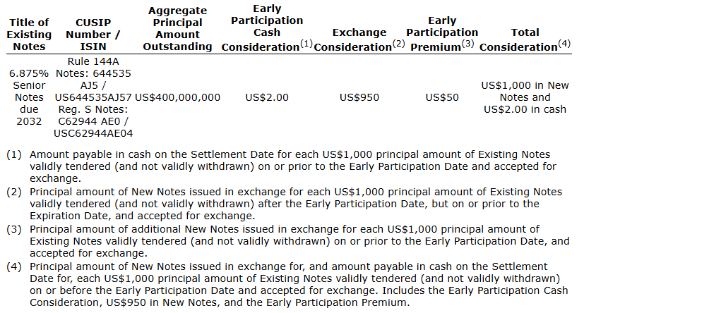 For each $1,000 principal amount of existing notes validly tendered and not validly withdrawn at or prior to the early participation date, eligible holders of existing notes will be eligible to receive the total consideration set out in the table above, which includes early participation cash consideration of $2.00 in cash and an early participation premium, payable in additional principal amount of new notes, of $50. To be eligible to receive the total consideration, eligible holders must have validly tendered and not withdrawn their existing notes at or prior to the early participation date and beneficially own such existing notes at the expiration date. For the avoidance of doubt, unless the exchange offer is amended, in no event will any holder of existing notes receive more than $1,000 aggregate principal amount of new notes for each $1,000 aggregate principal amount of existing notes accepted for exchange.