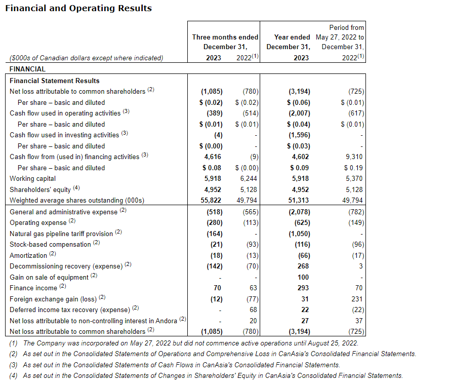 CANASIA ENERGY CORP. 2023 YEAR-END FINANCIAL & OPERATING RESULTS