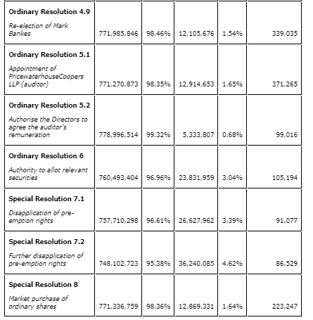 In accordance with LR 9.6.2R, a copy of the results of the AGM, along with a copy of resolutions passed other than those concerning ordinary business at the AGM, have been submitted to the National Storage Mechanism and will shortly be available for inspection.
